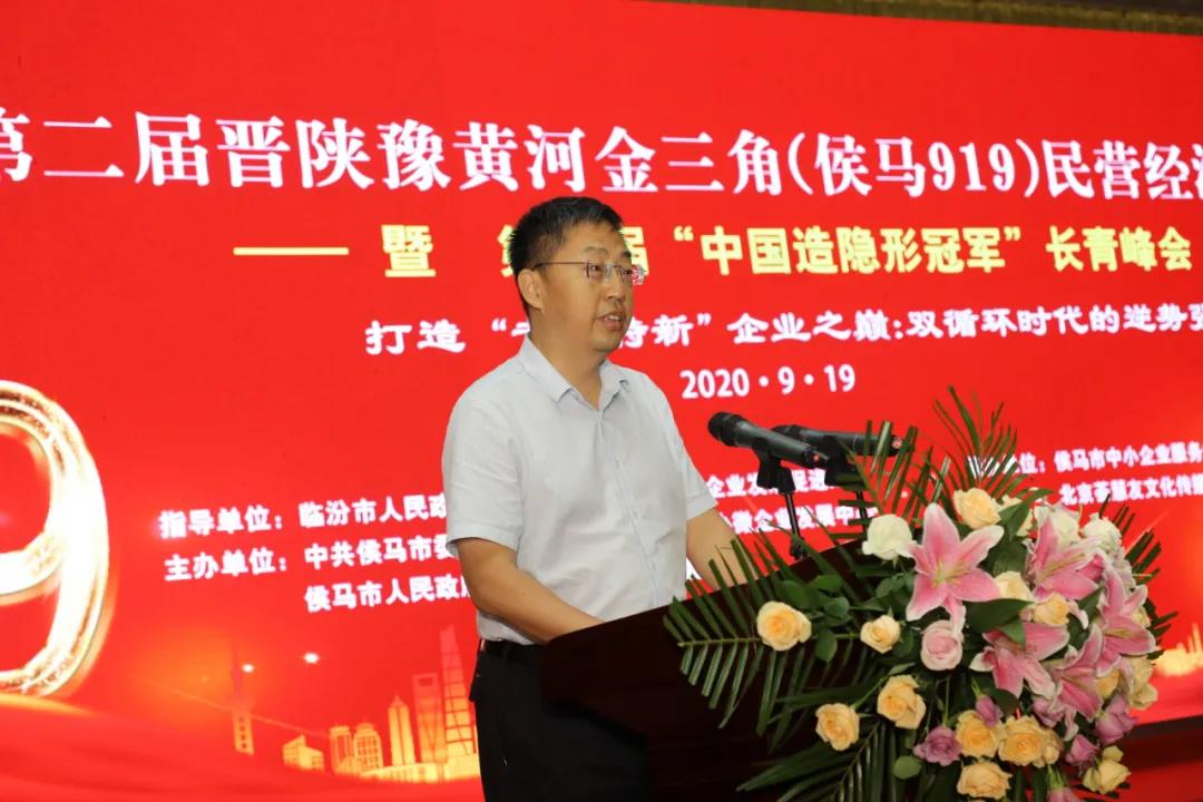 临汾市政府副秘书长张林海首先代表主办方致辞。他表示:民营企业是创业、就业的主要领域,是技术创新的重要主体,是推动经济发展不可或缺的重要力量。今年以来,面对疫情当前的复杂形势,习近平总书记强调要“加快形成以国内大循环为主体、国内国际双循环相互促进的新发展格局”。勉励广大企业家要做创新发展的探索者、组织者、引领者,努力把企业打造成为强大的创收主体。这次活动,既是主动创新思维,打造“专精特新”,做双循环时代强者的重要尝试,更是深入贯彻习近平总书记视察山西重要讲话、重要指示,战胜各种风险挑战,推动经济持续增长,在转型发展上率先趟出一条新路的有力举措。山西省工信厅党组成员、省小企业发展促进局党组书记、局长薛江炤作为本次大会的指导单位,山西省工信厅党组成员、省小企业发展促进局党组书记、局长薛江炤表示:2020年是非常特殊的一年,本次会议的主题为“打造‘专精特新’之巅,双循环时代的逆势强者”,正是在以经济内循环为主的双循环战略指引下,深入贯彻习近平总书记关于“培育一批‘专精特新’中小企业”重要指示精神,培育挖掘出更多的“小巨人”“单项冠军”“隐形冠军”,带动黄河金三角民营经济健康快速发展的点题之笔。山西省委、省政府高度重视“专精特新”企业培育,提出了很多的具体的思路和举措,为培育更多优秀的企业提供了有力的政策保障。下一步,山西省将继续积极为“专精特新”企业发展排忧解难、擂鼓助威,在资金、人才、技术、市场等方面靠前服务、支梁架桥,持续激发企业高质量发展的强劲内生动力。侯马市市委副书记、市长黄晓君则在关键发言中介绍了一个少有认知的侯马。她介绍道:侯马是山西南部重要的交通枢纽和商贸物流中心城市。作为国家关中平原城市群发展规划和晋陕豫“黄河金三角”区域协同发展战略布局的关键节点,作为山西省对外开放的重要窗口,侯马拥有五大核心优势,包括在文化历史、区位交通、营商环境等方面,侯马环境优越、宜居宜业。同时,她透露,侯马市2020年版《招商引资实施方案》和开发区《创新发展优惠政策》即将出台。两项政策,都从产业扶持、用地优惠、金融帮扶、创新奖励、营商环境、诚信建设等方面做出了明确规定和承诺,希望更多的人到侯马投资兴业。
